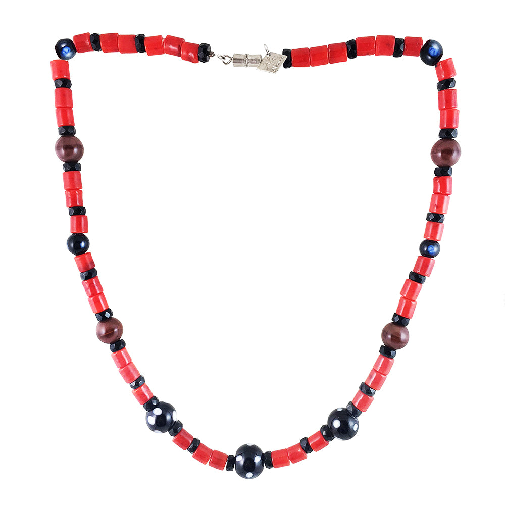 Make a statement with the captivating Alexandro Necklace, where Cape Verdean Conta Di Ojo beads take center stage, beautifully complemented by rich red, black, and brown beadwork. Handcrafted with precision by Alzerina in the USA, this necklace showcases a timeless design, featuring glass beads and intricate Black Onyx detailing.