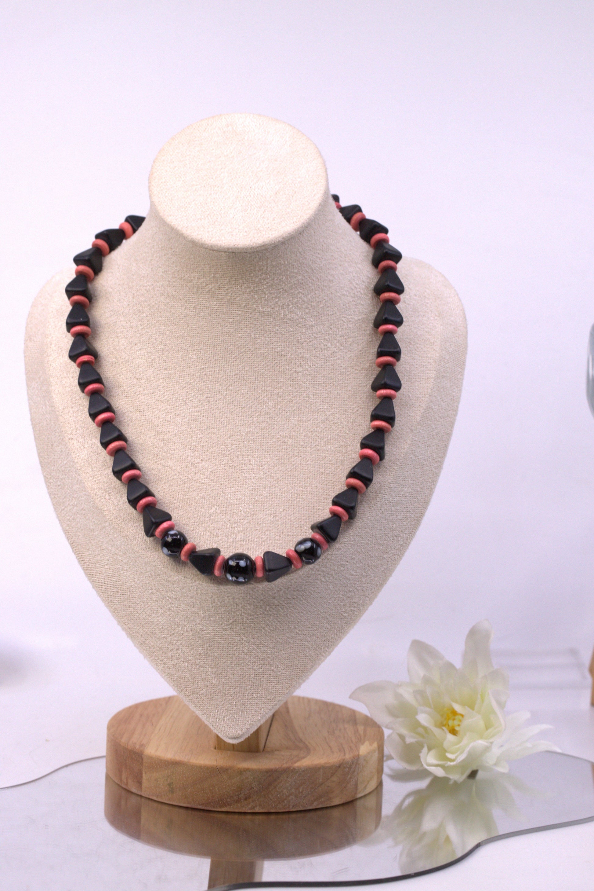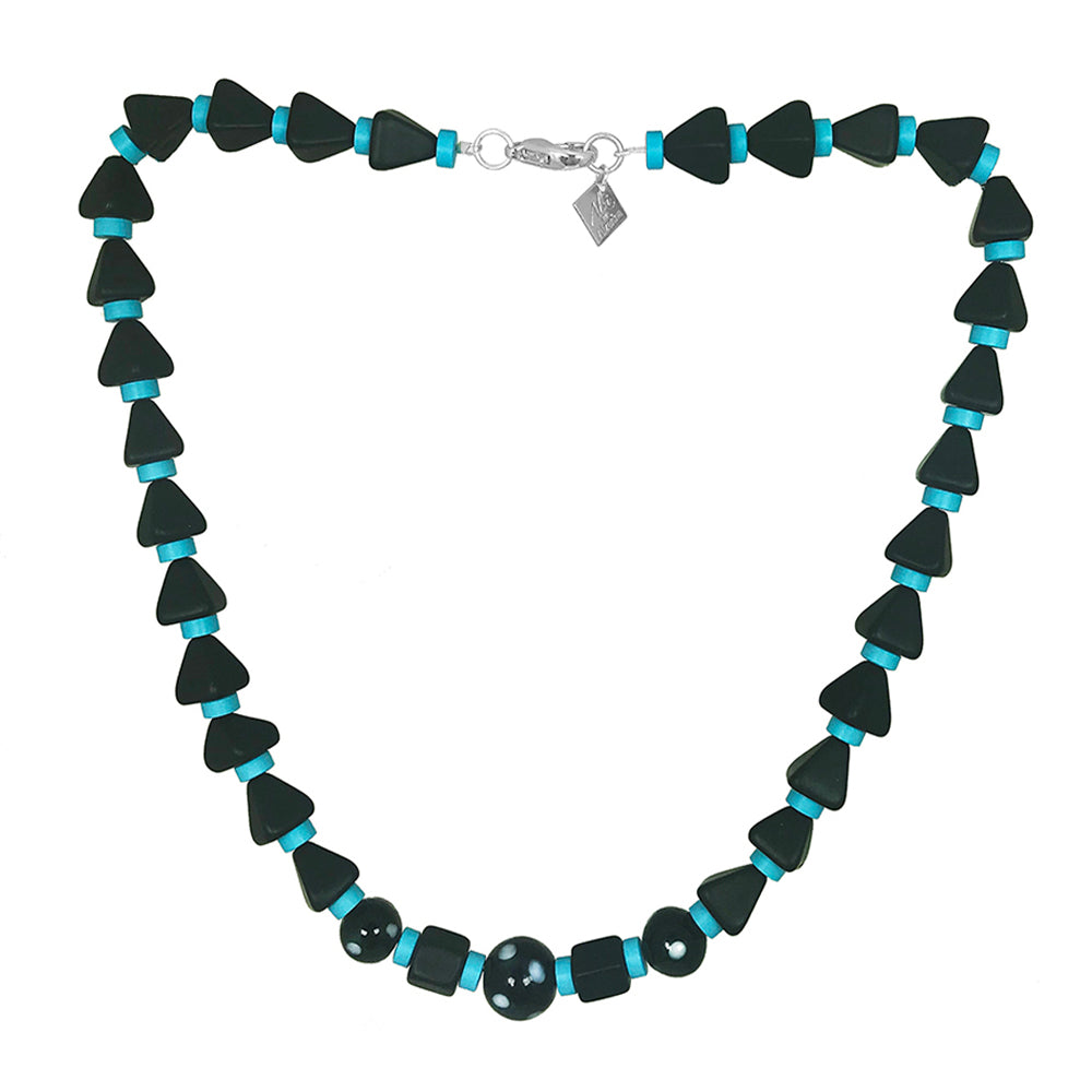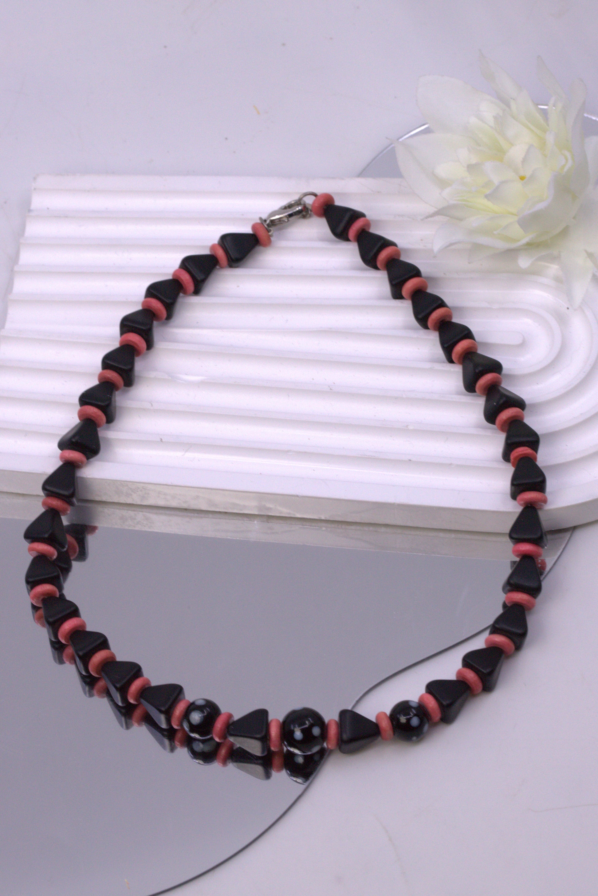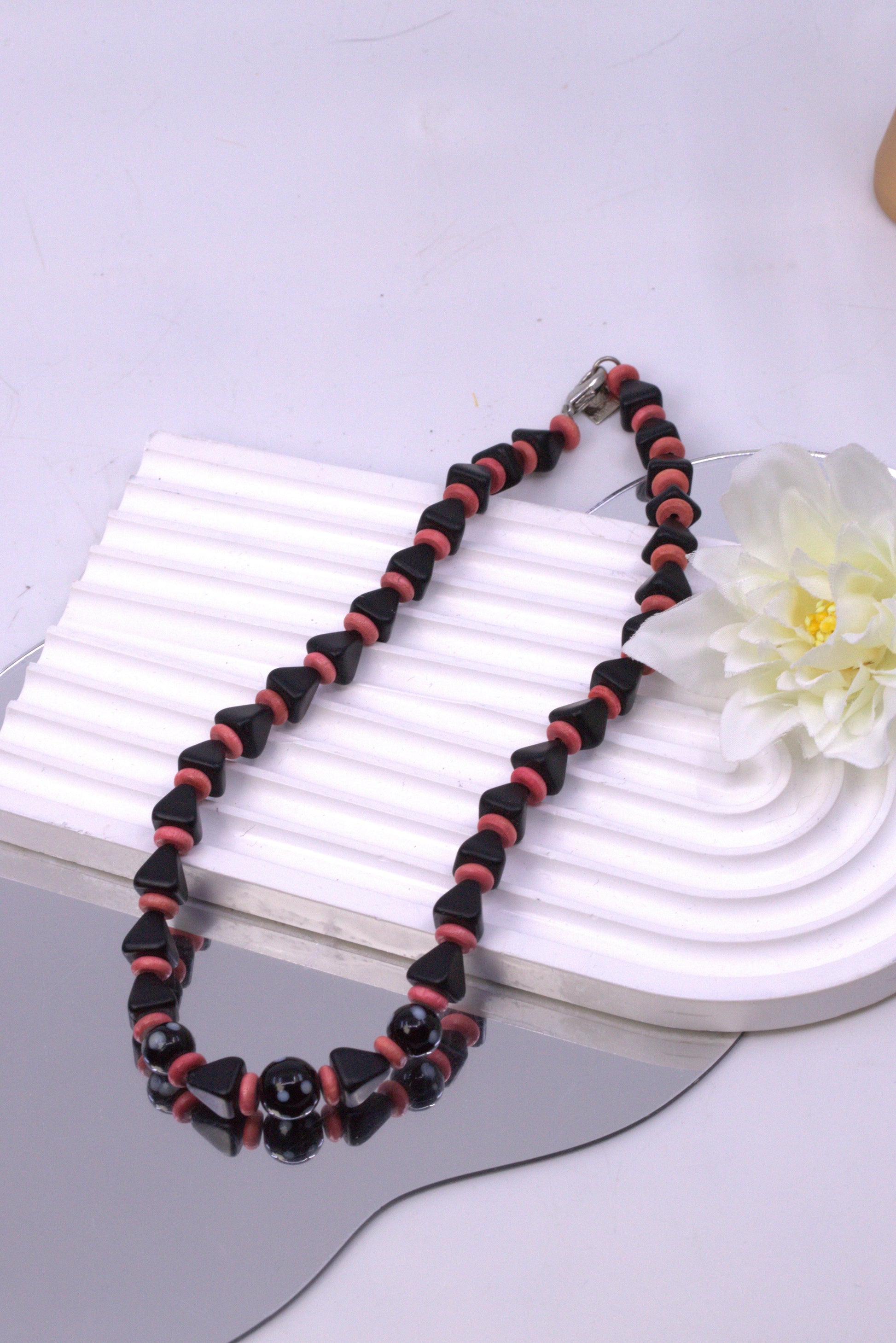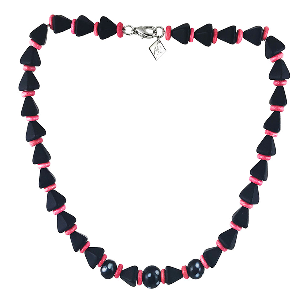 Our Amilcar Necklace features a sleek, geometric design with unique triangular beads, creating a modern and bold look. Accented with coral-red or blue painted wooden dividers and Conta Di Ojo beads, this necklace adds a vibrant pop of color to any outfit.
