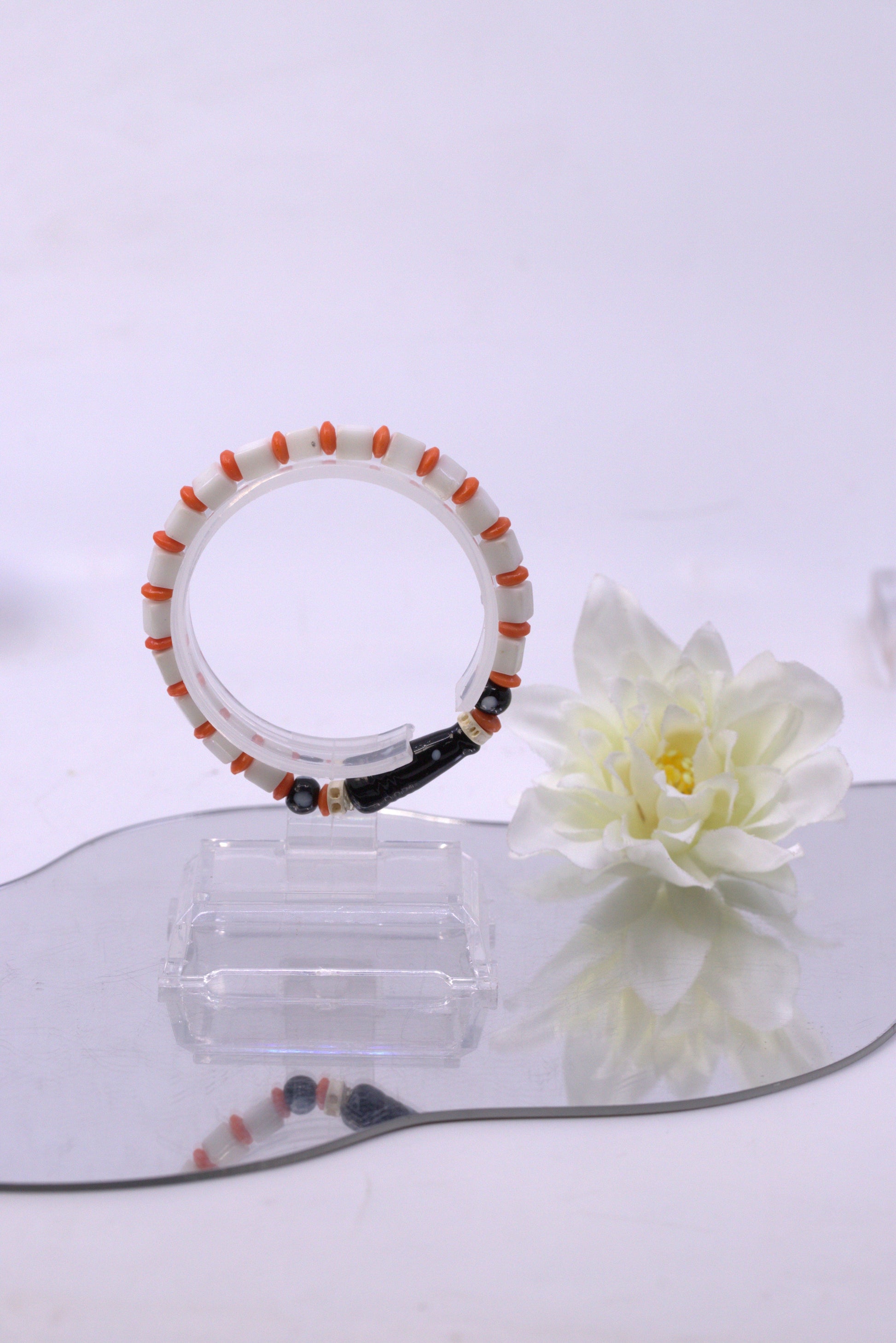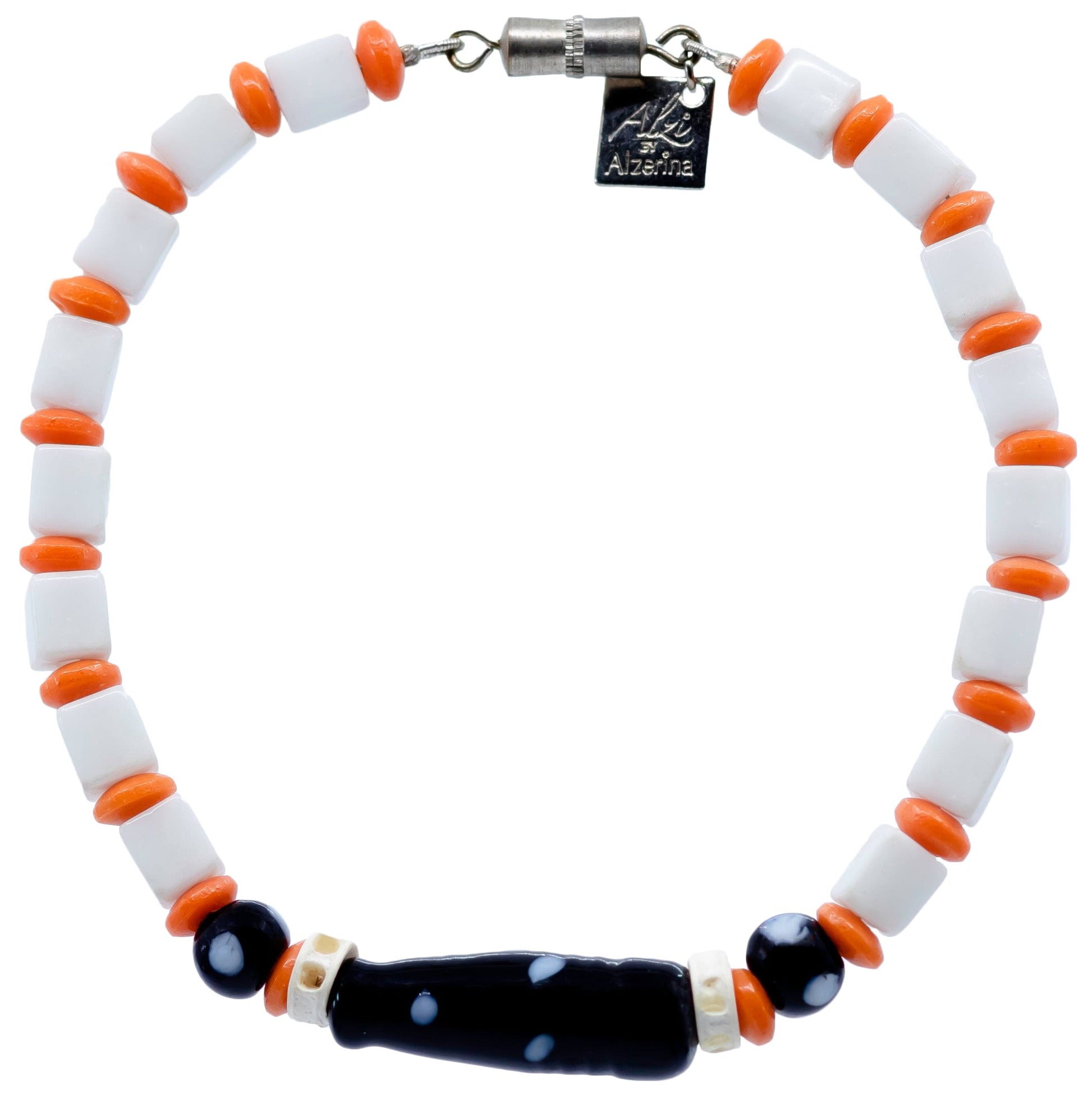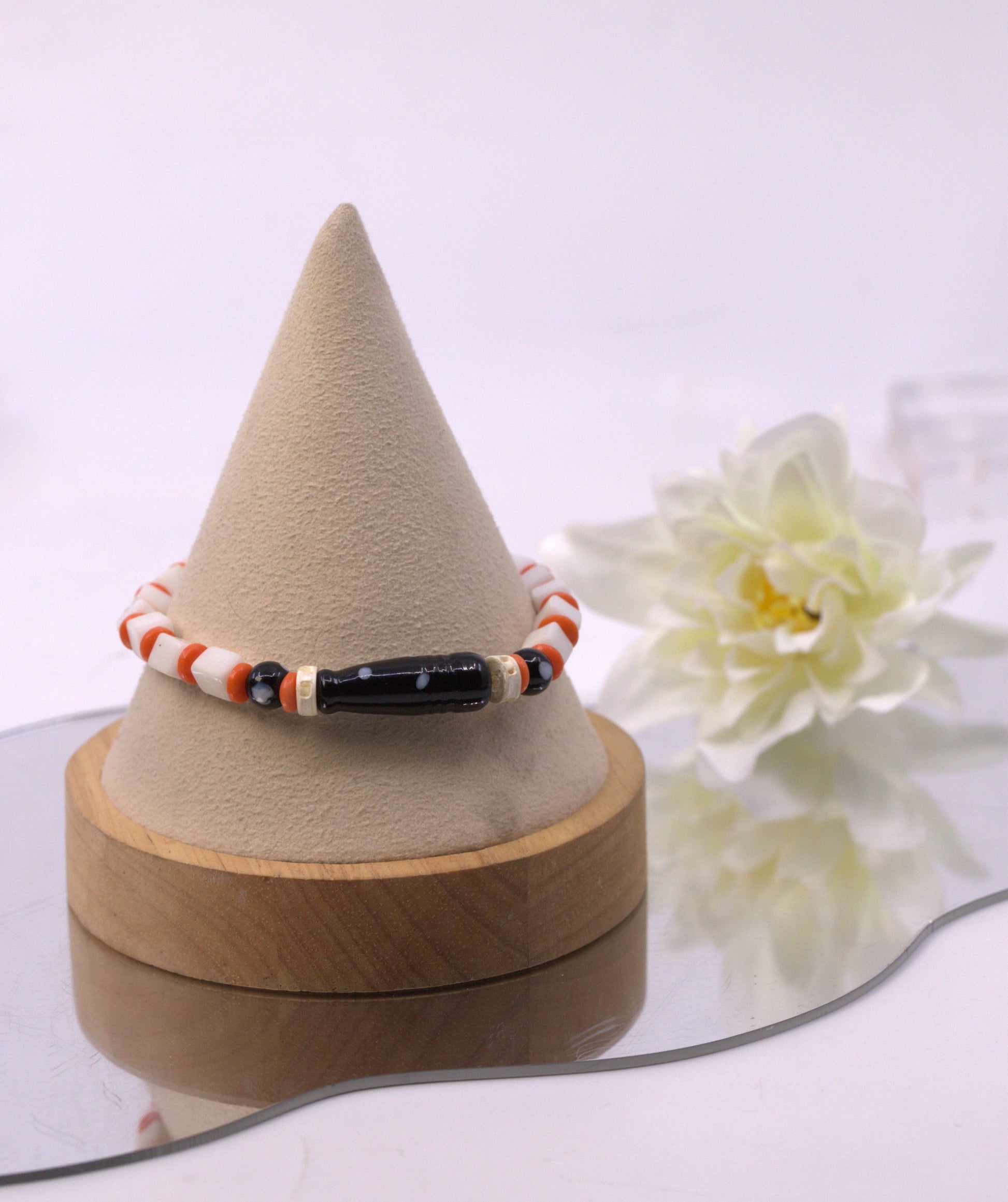 The Jorge Bracelet is an exceptional piece that symbolizes strength and positivity. Crafted with Konta D'oju beads, along with vibrant orange and white beads, this bracelet adds a touch of sophistication to any outfit.