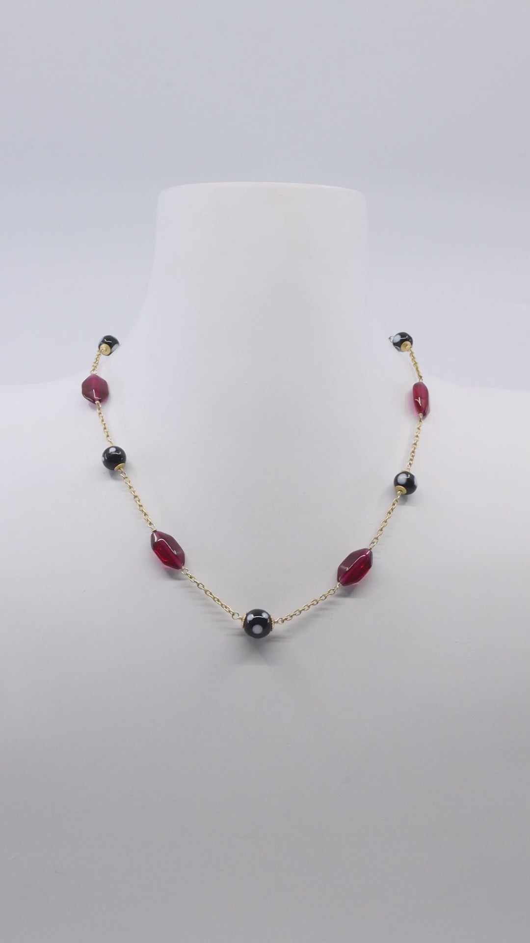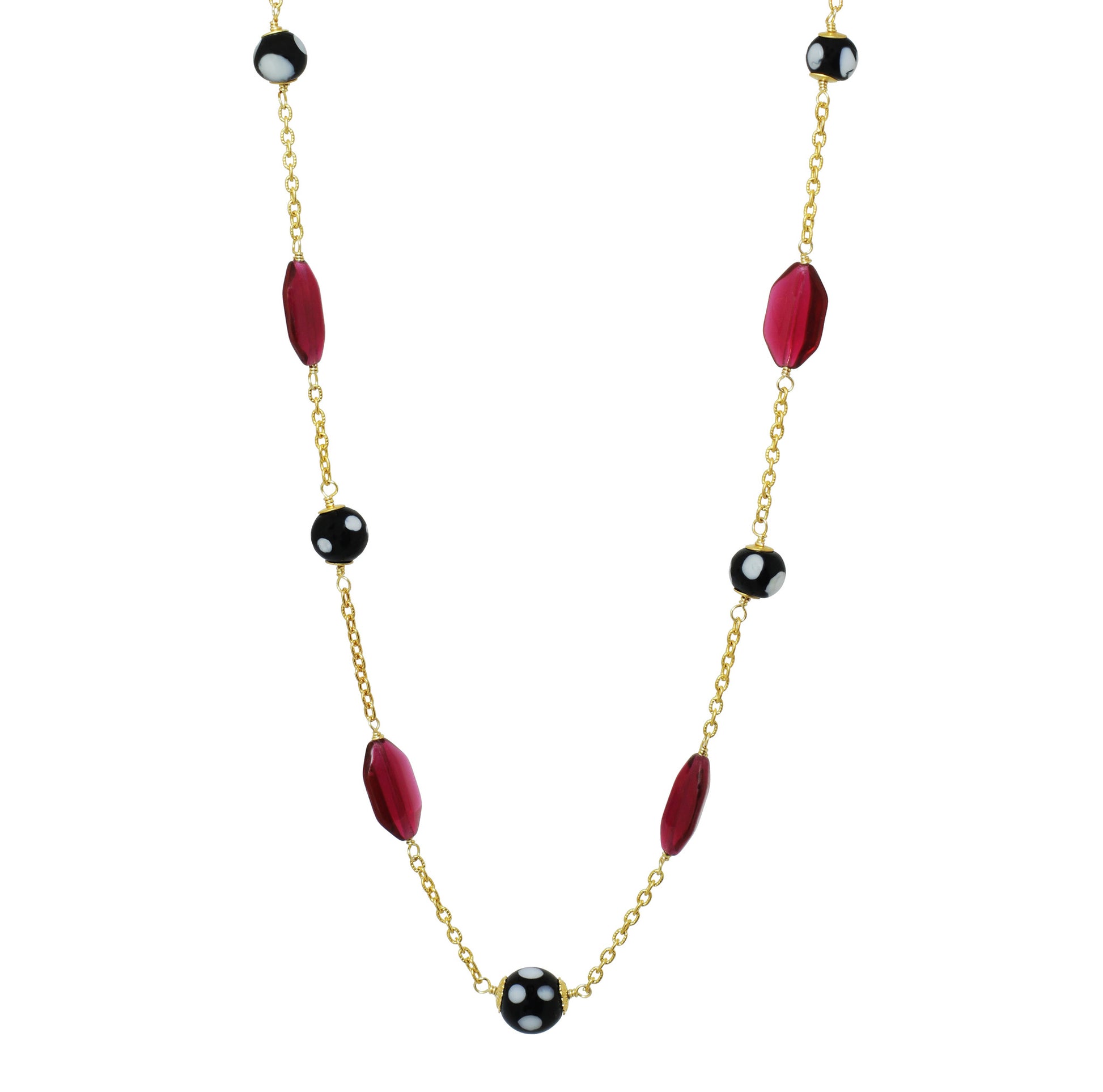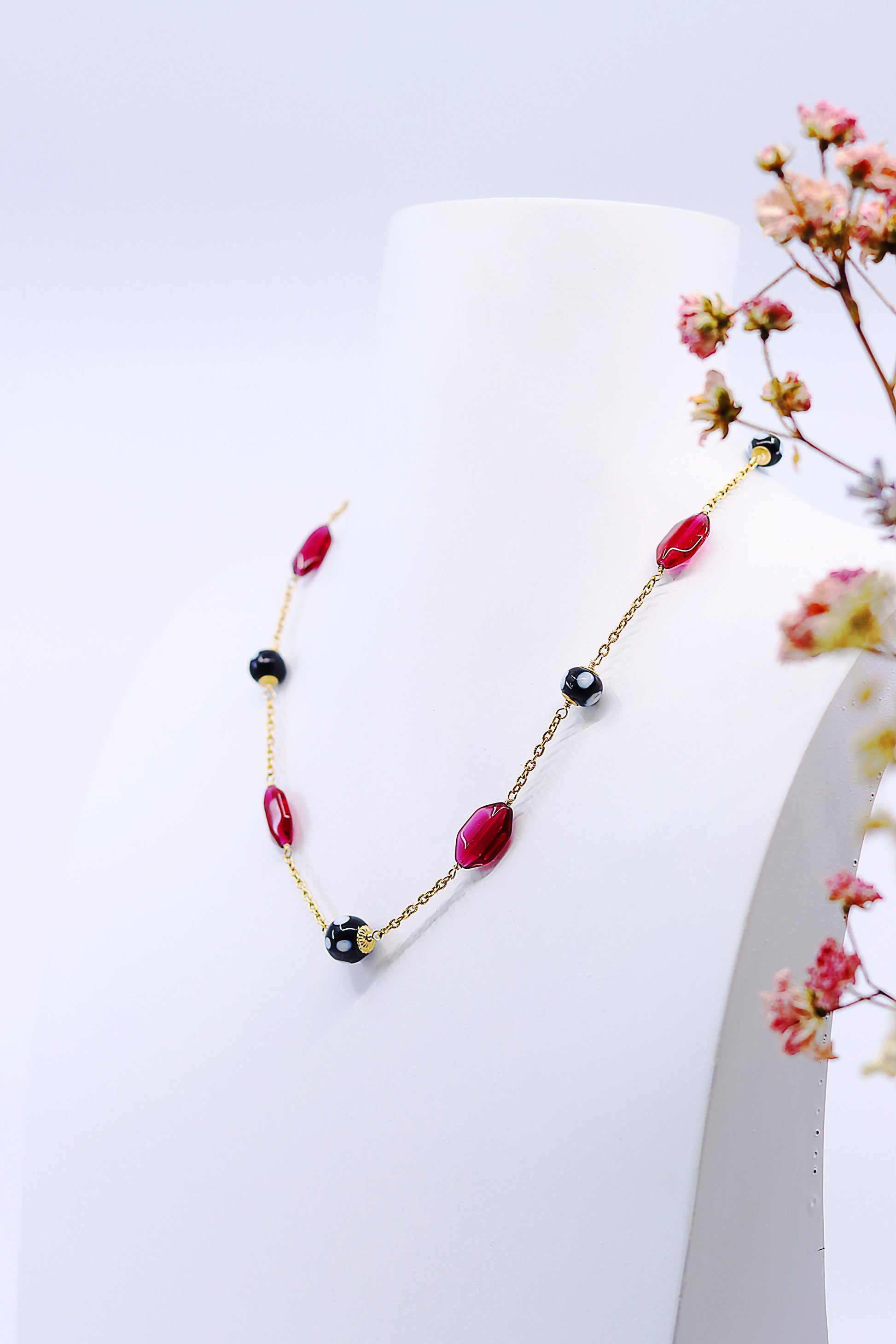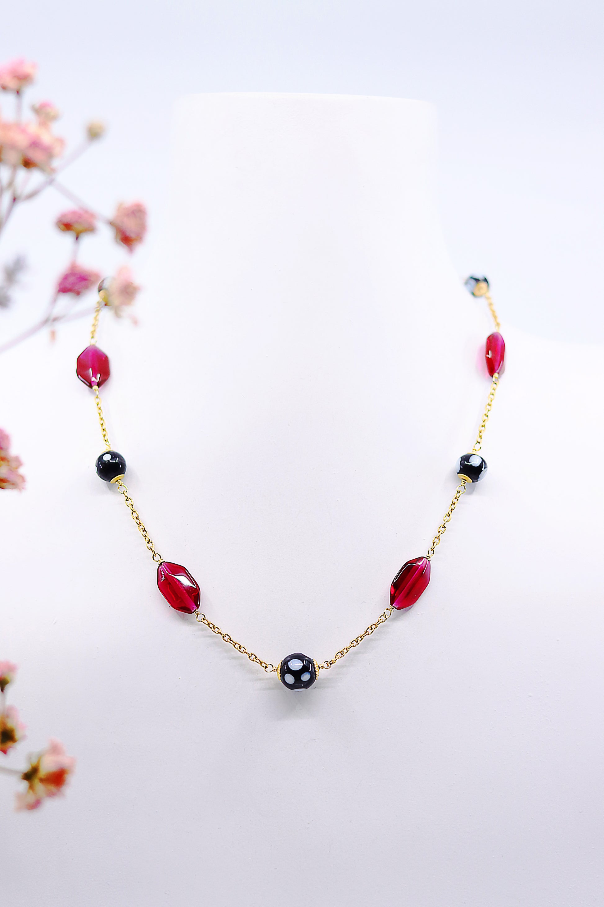 Namorada necklace – a versatile accessory that effortlessly breathes life into your ensemble. Handcrafted by Alzerina in the USA, this unique piece combines vibrant red crystals, vintage beads, and Conta Di Ojo beads, creating a stunning composition that not only refreshes your energy but also adds a pop of color to your outfit.
