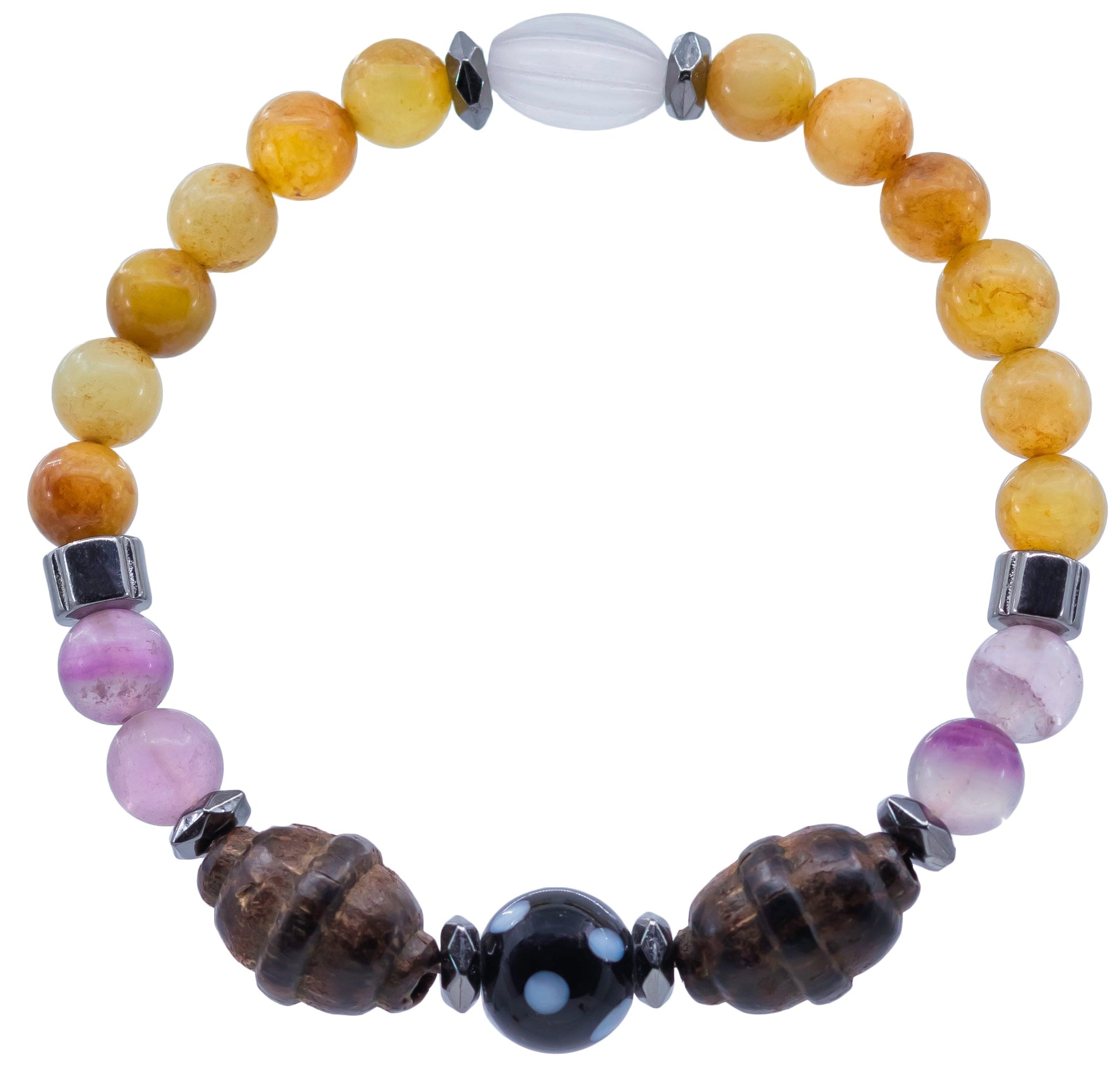 The vibrant combination of yellow and amethyst beads creates a striking yet harmonious look, making it the perfect accessory for any party or special occasion. With its unique blend of colors, the Benvindo Bracelet effortlessly elevates your style and radiates charm.