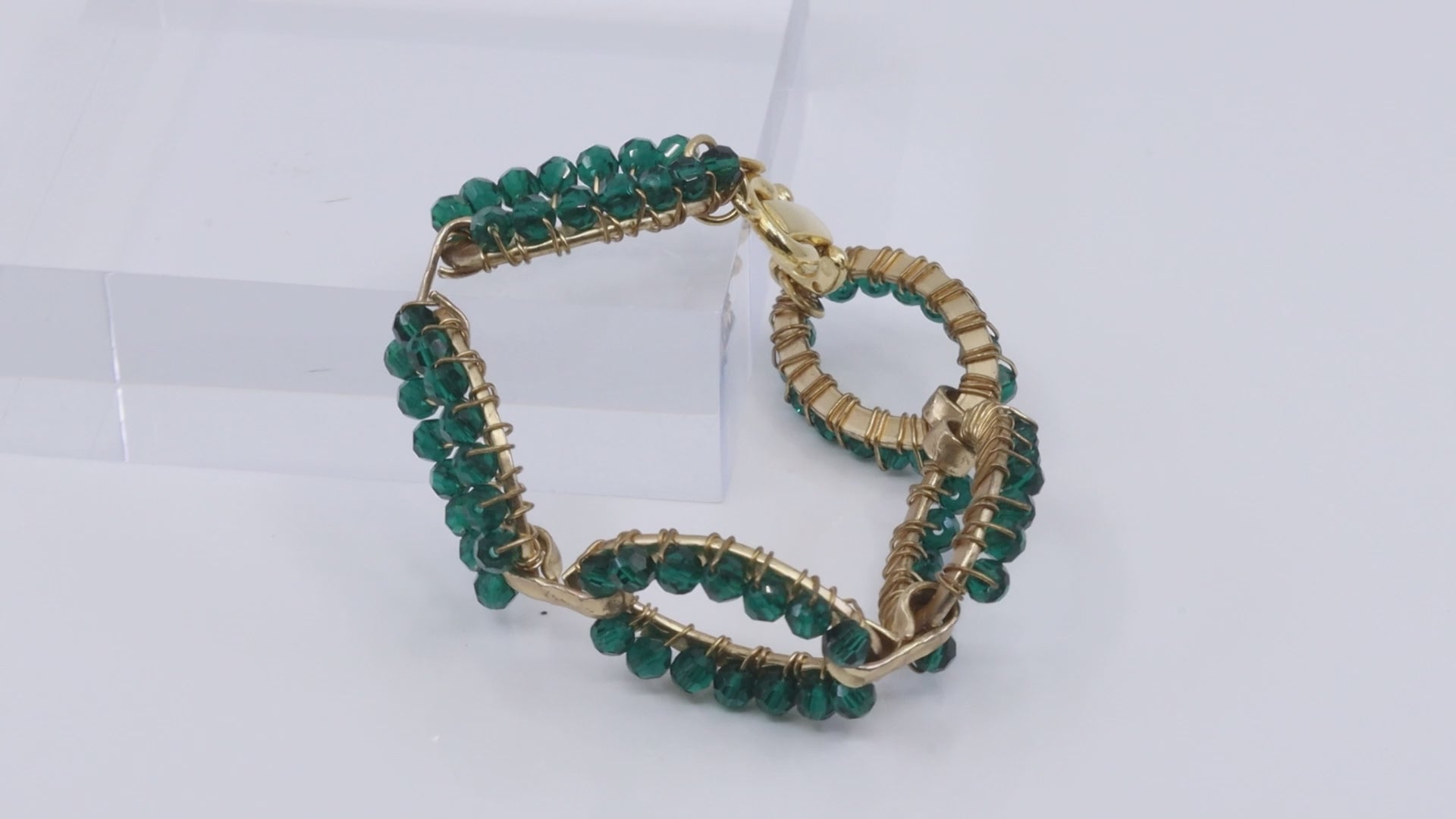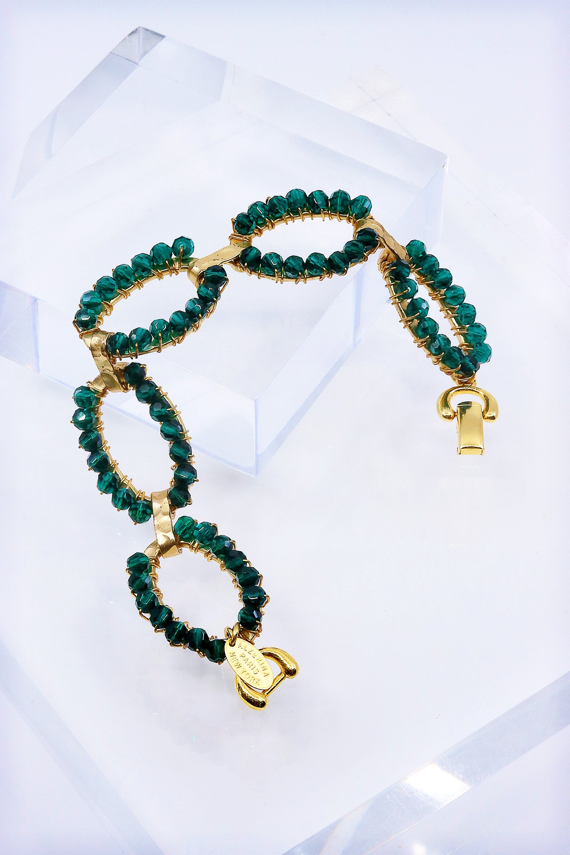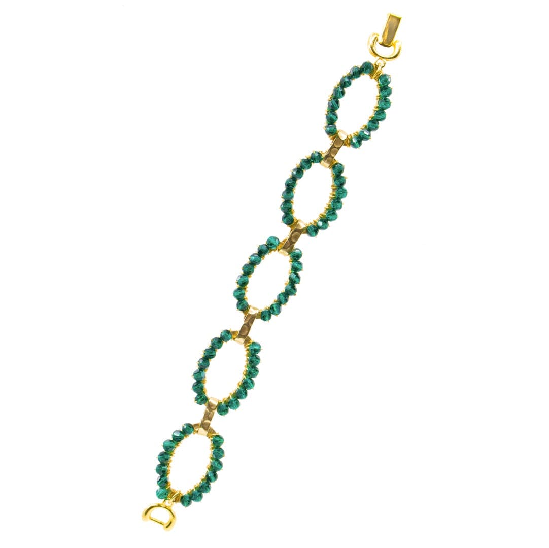 The Patricia Bracelet is inspired by the timeless symbol of infinity, offering a graceful and meaningful design. Crafted with a stunning green Austrian crystal in the shape of an infinity symbol, this bracelet adds a vintage touch to any outfit.