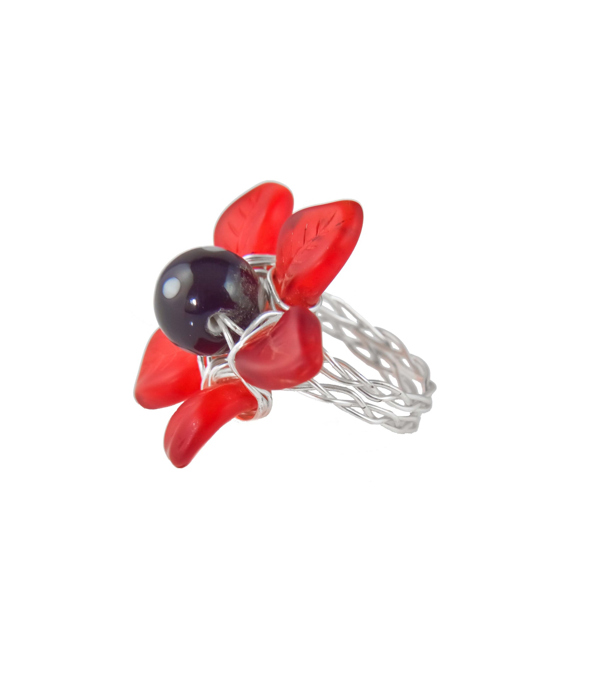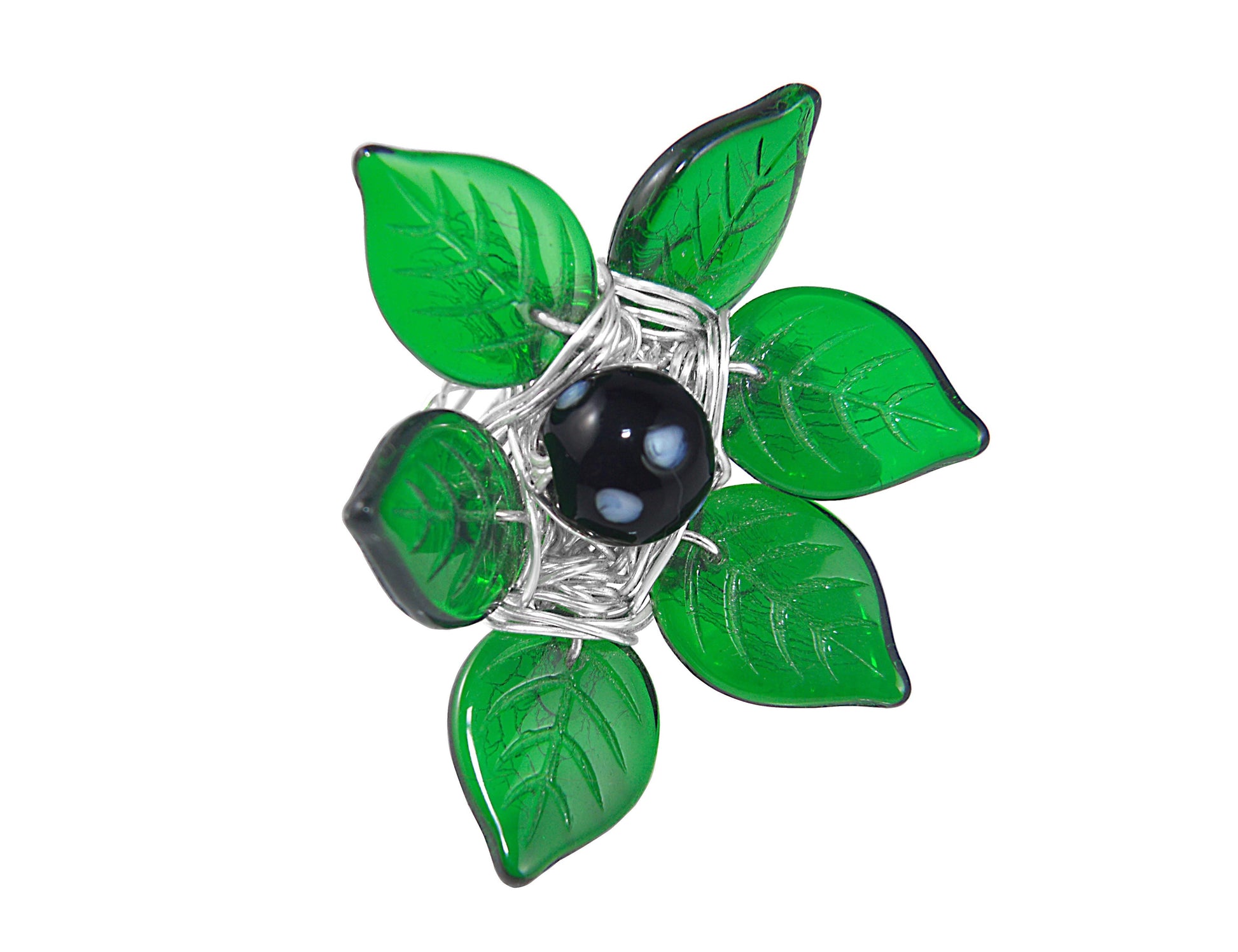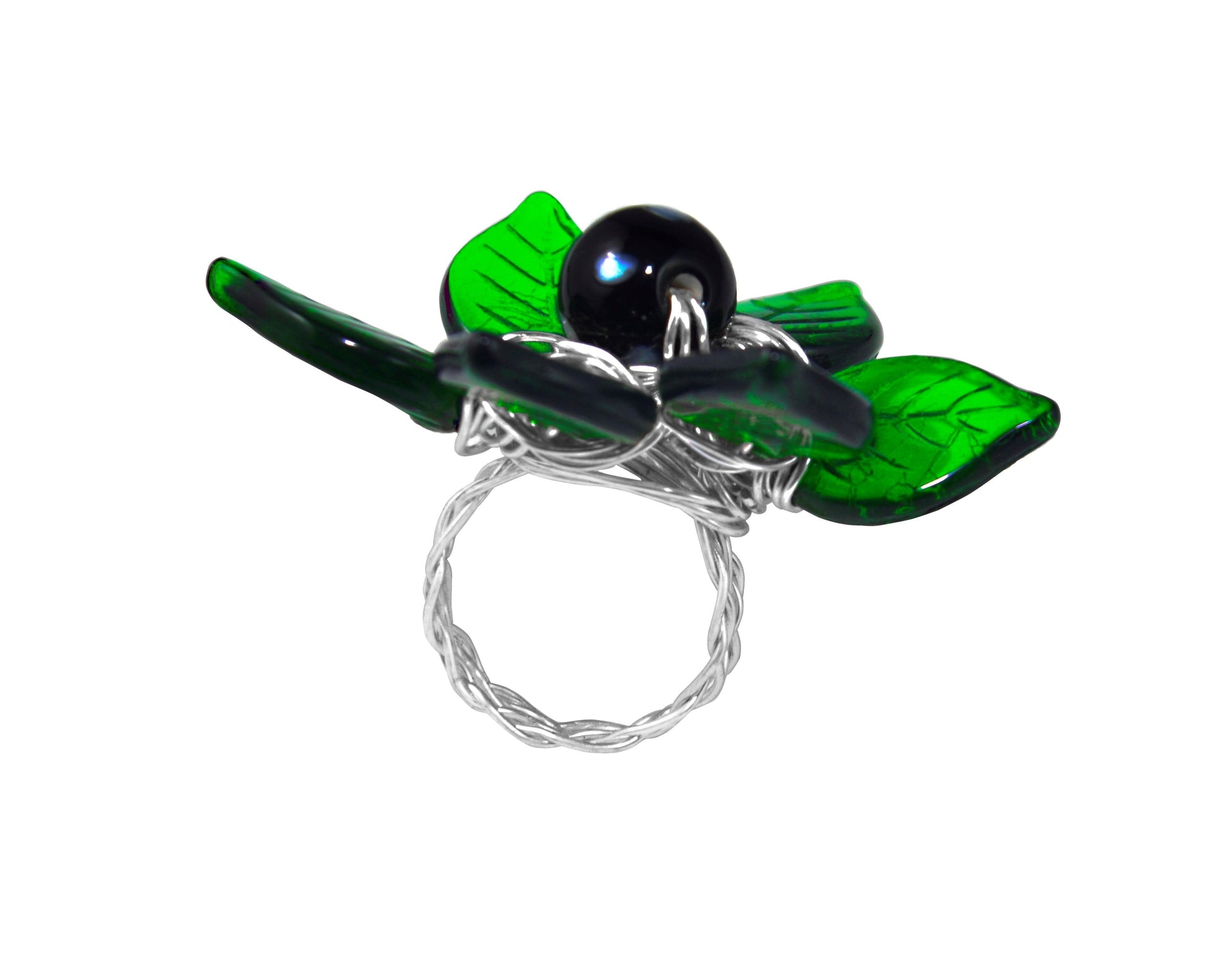 This statement ring features six glass, leaf-shaped beads and one central Conta Di Ojo bead, known for its legendary power to protect against evil spirits. Handcrafted with silver-plated wire, this ring adds a bold and unique touch to any outfit.