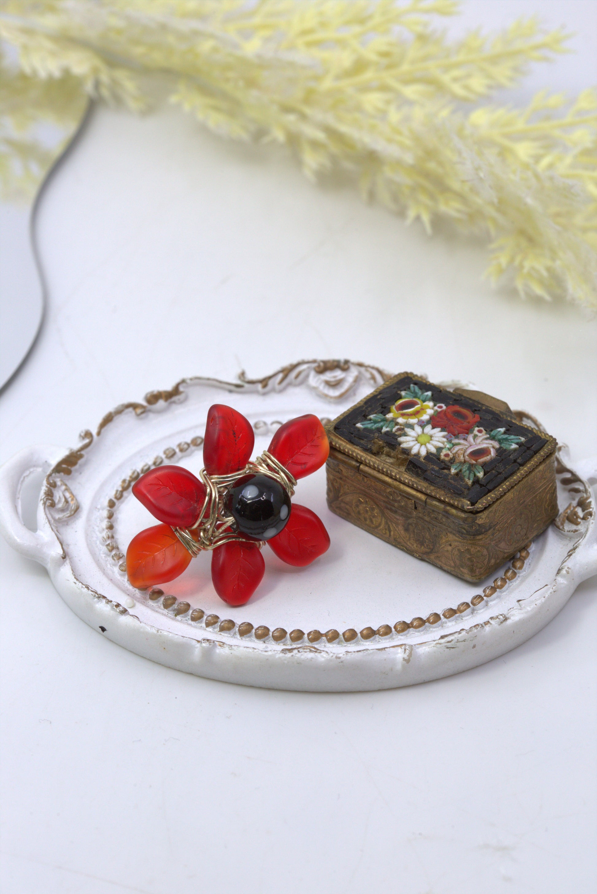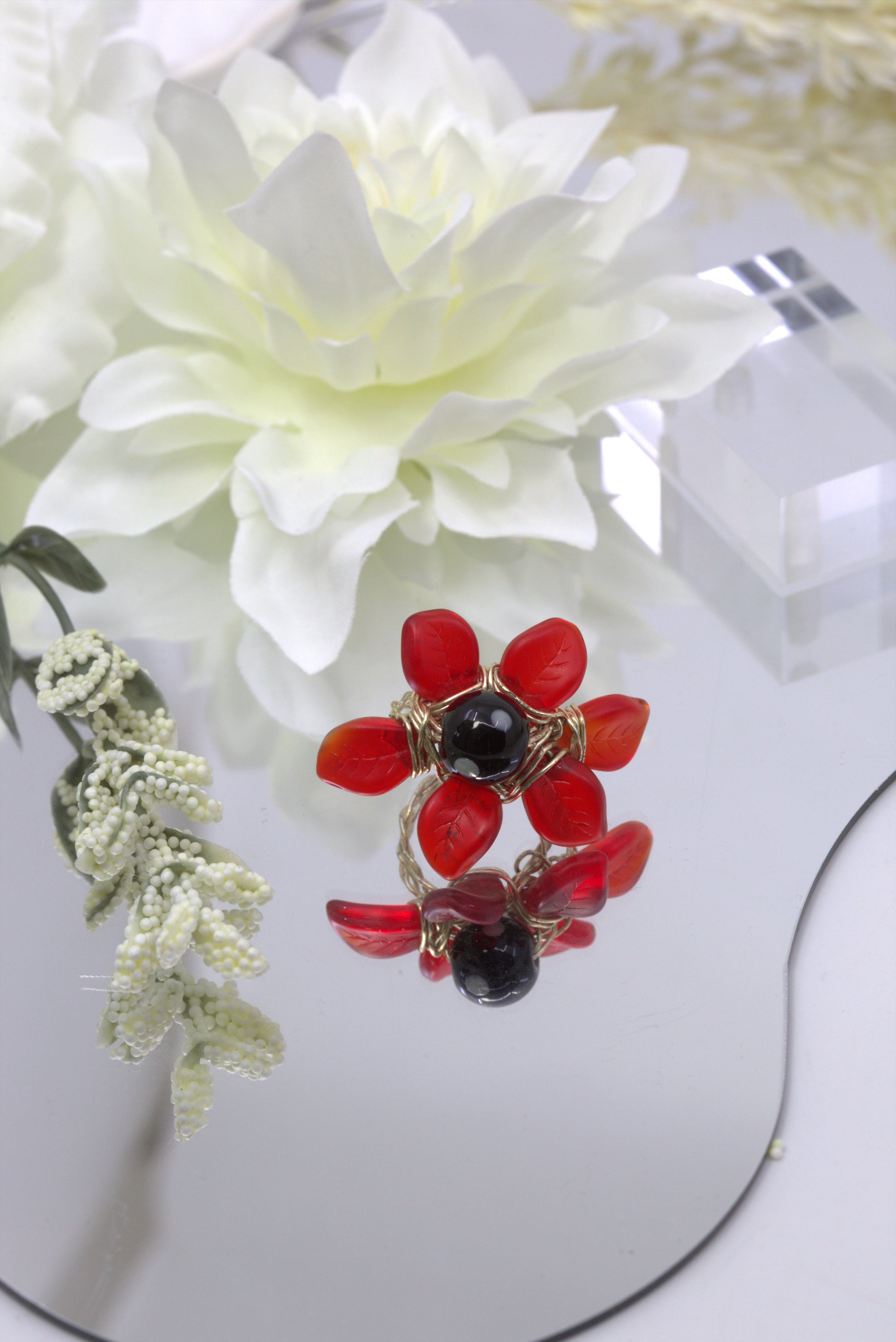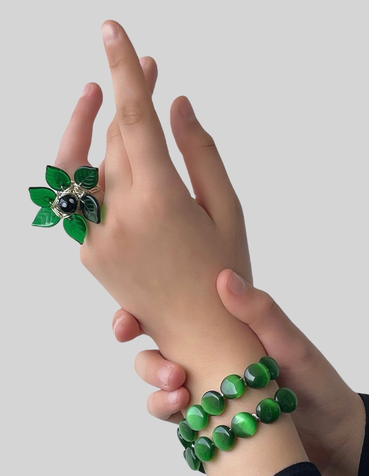 This statement ring features six glass, leaf-shaped beads and one central Conta Di Ojo bead, known for its legendary power to protect against evil spirits. Handcrafted with silver-plated wire, this ring adds a bold and unique touch to any outfit.