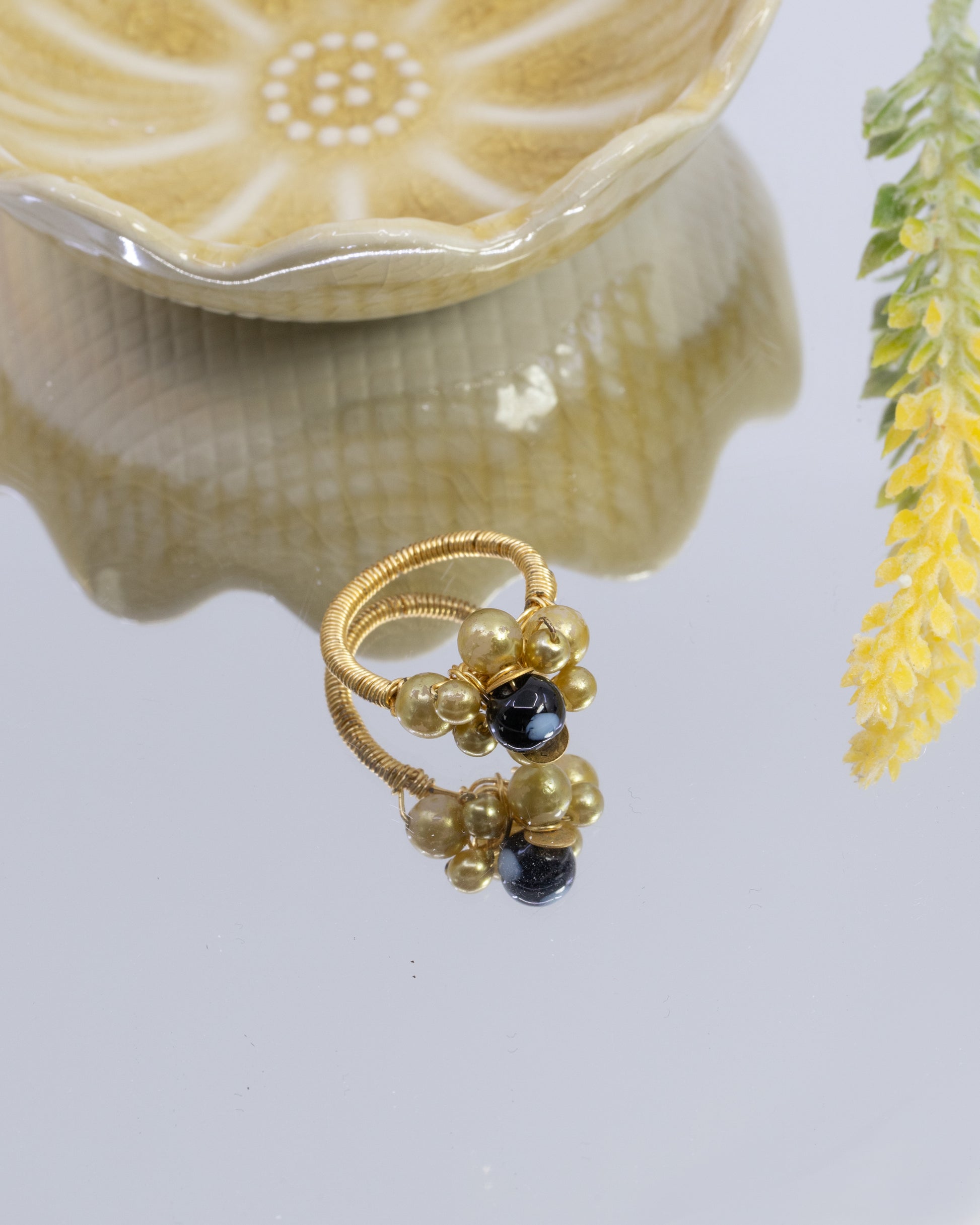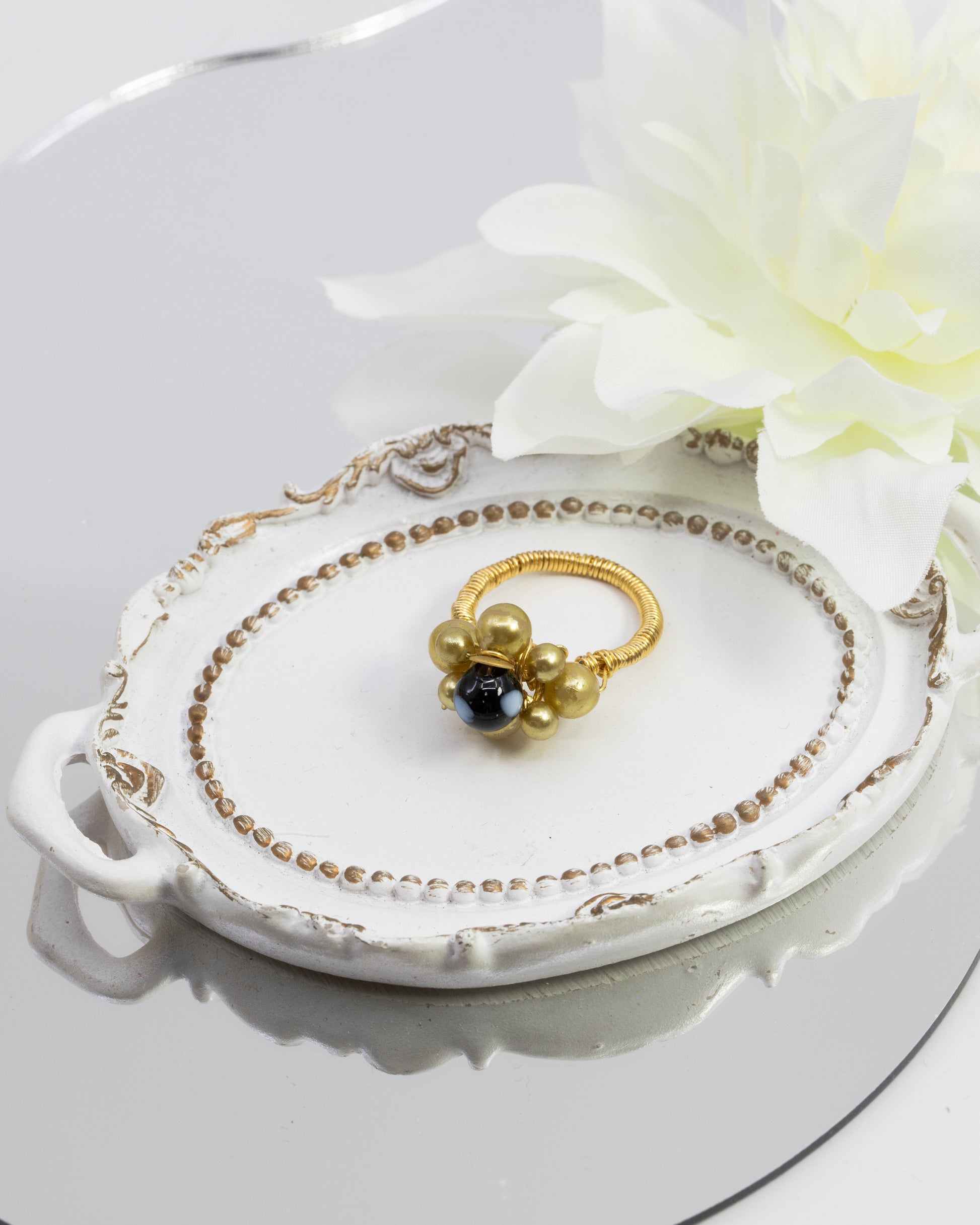 The Rosa Ring is a beautifully handcrafted piece of jewelry, featuring gold-plated wire with delicate gold beads and a striking Conta Di Ojo bead at the center. This handcrafted gold jewelry combines both elegance and meaning, making it the perfect accessory for any occasion.