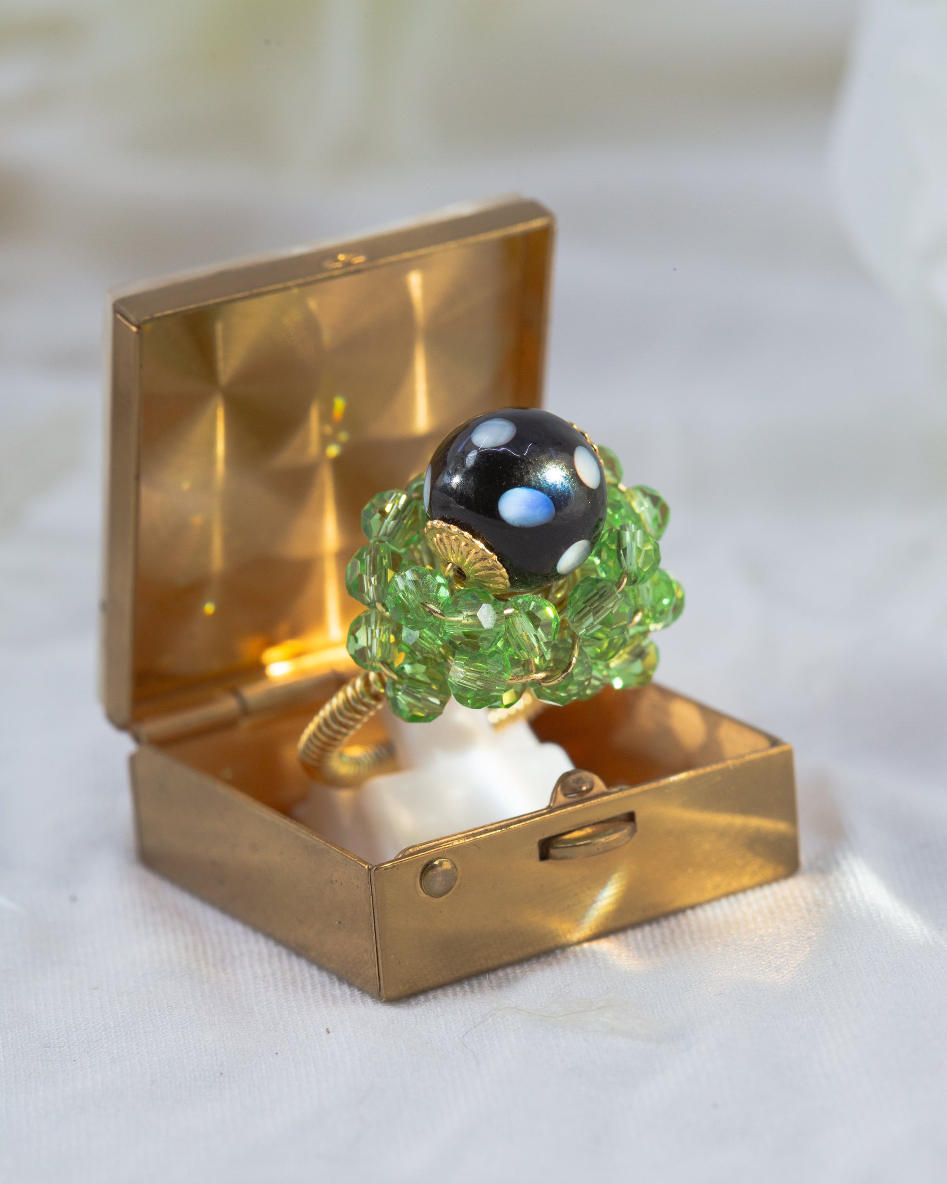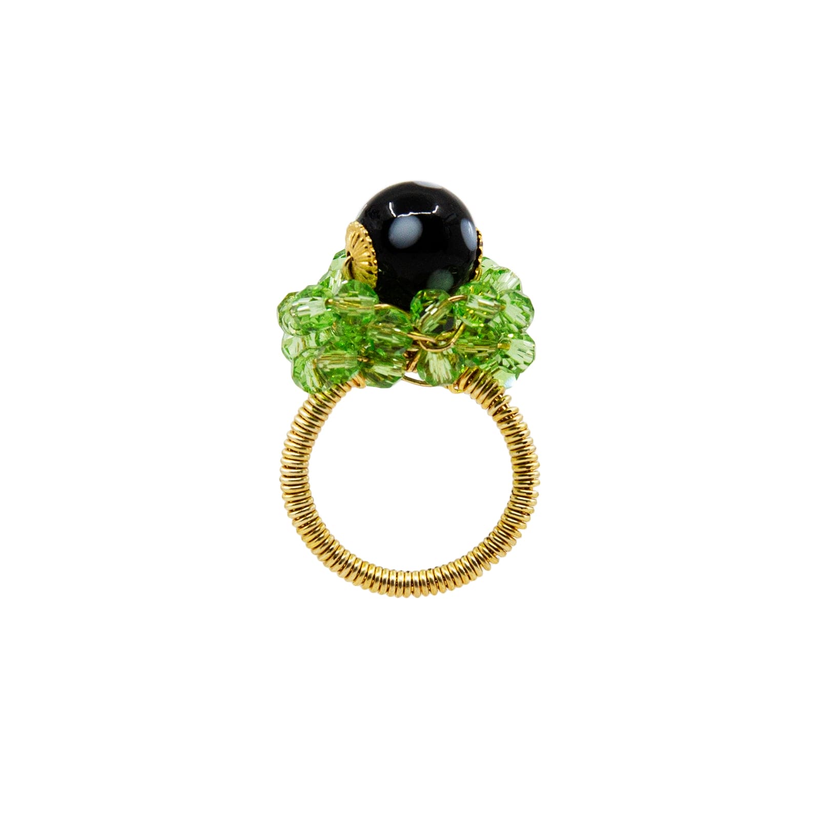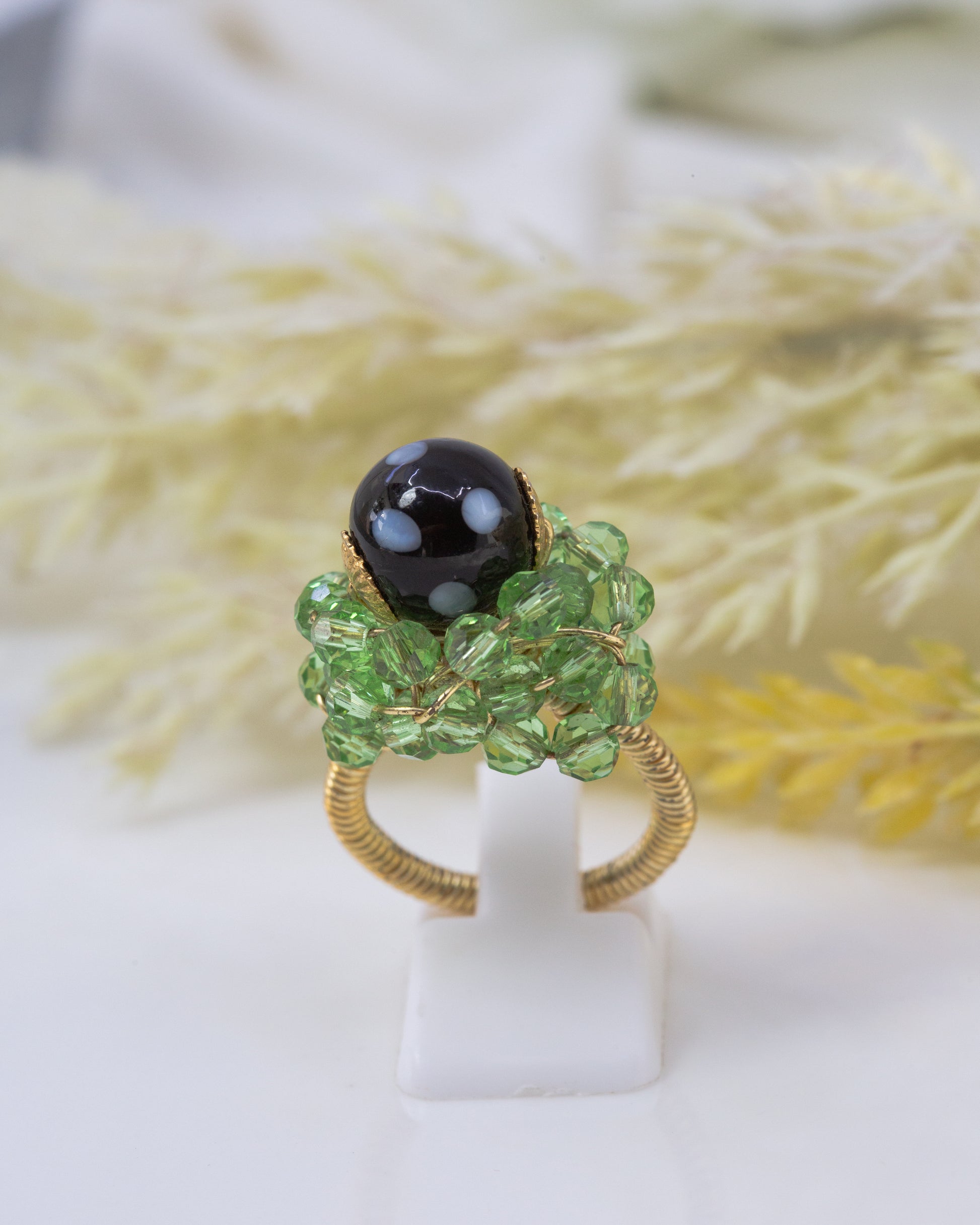 The Sylviane Ring is a stunning statement piece that elevates any look with its exquisite design. Crafted with gold-plated wire, the ring features a central Conta Di Ojo bead, revered for its cultural significance, surrounded by sparkling green Austrian crystals. This unique combination of vibrant crystals and the protective bead adds both elegance and charm to your style.